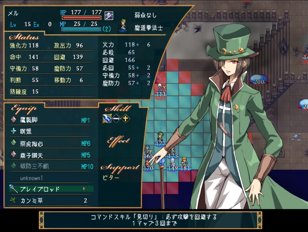 スキルは敵の攻撃を回避する【見切り】と回避値の差が高いと威力が上がる【強撃】の2つ。