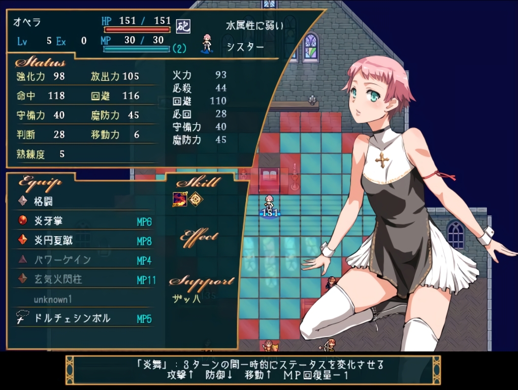 ステータスは絵に描いたようなシスター仕様で攻撃面も防御面も際立つものはなく持ち味はMPが少し高いことくらいである。