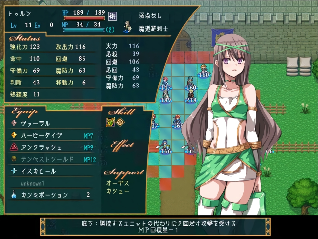 【庇う】は2回まで味方の代わりに攻撃を受けてその際に防御力が20上がるという実にトゥルンらしい強力な効果になっている。