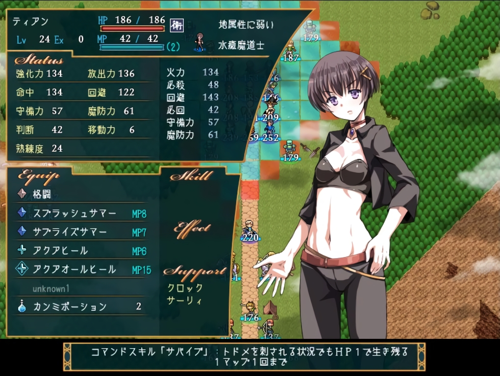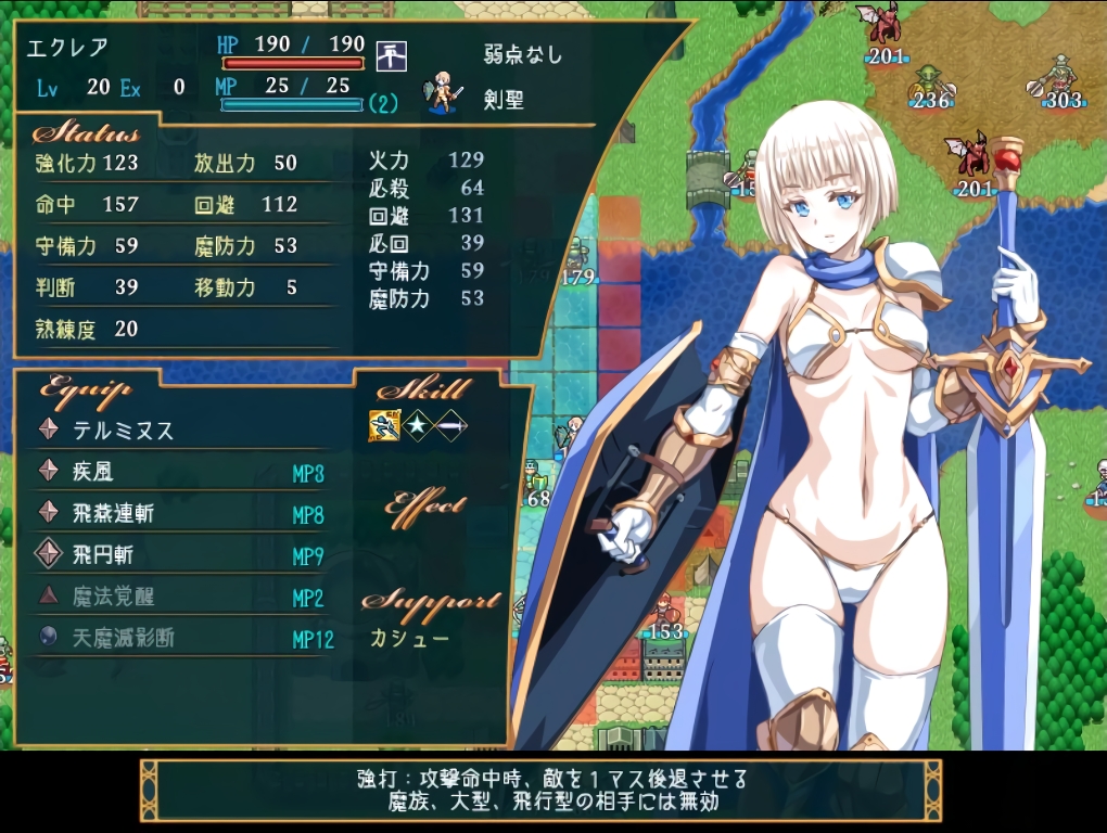 スキルは攻撃時に敵を1マス交代させる【強打】、取得経験値が110%になる【努力】、敵よりも回避値が20高いとダメージが増える【強撃】の3つと、意外にもスキルは豊富。