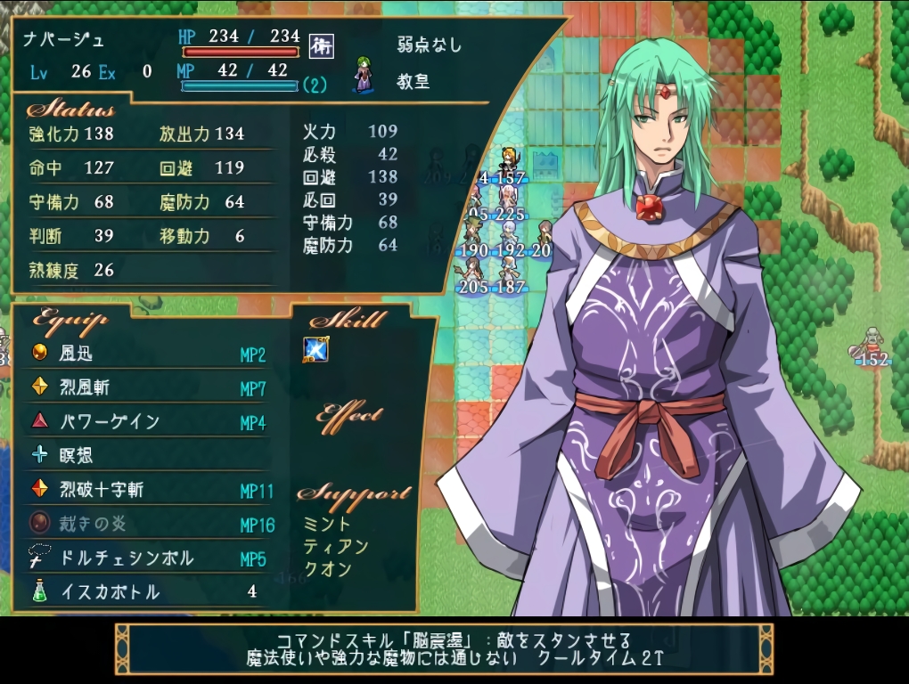 1番弱い風刃は射程4、次の烈風斬は射程2、1番強い烈破十字斬は射程1と教皇という名前から遠距離攻撃が得意なのかと思ったらその真逆を突っ走っている。