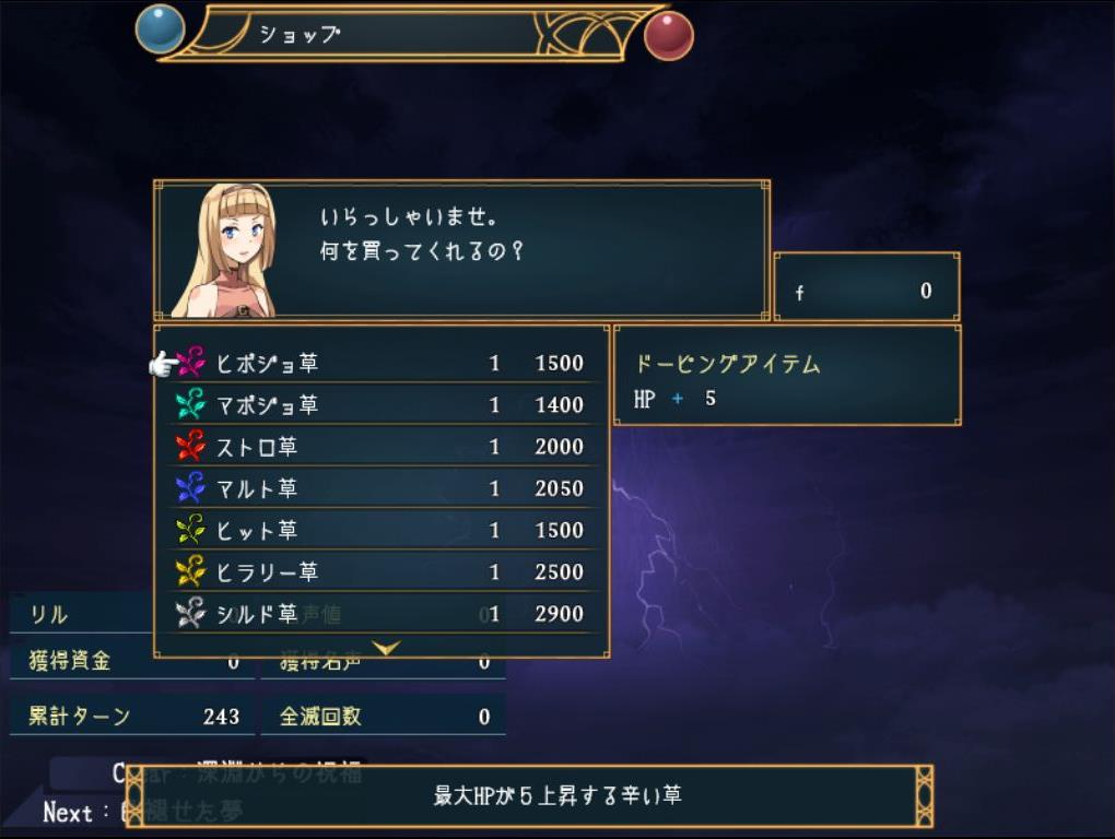 名声値を使って各ステータスを強化できるドーピングアイテムを購入出来るが、どれも微量なので使う場合は1人のユニットに集中して使った方が良い。