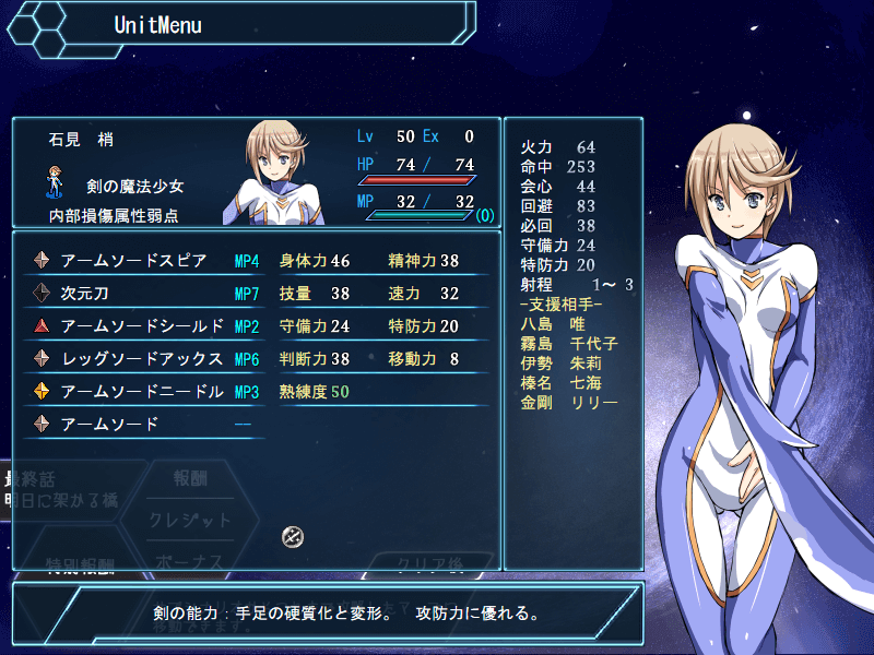 いちおうバフ技であるアームソードシールドの守備力+4は優秀だと思います、しかし敵の攻撃は射程2以上が多く、精神力依存のものばかりなので恩恵は極めて少ない。
