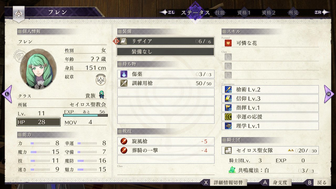 そのため、フレンには魔法攻撃ではなくサポートキャラとして活躍してもらおう(速さの成長率が低いのもそのためなのか?)