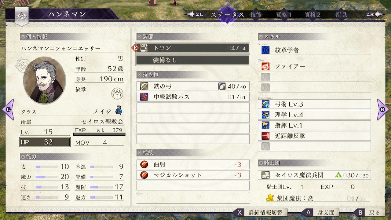 紋章学に詳しいだけあって紋章を持っているマイユニットにも興味津々、フレンが連れ去れた際にも生徒たちからフレンが持っている紋章の研究をするためにさらったと疑いをかけられるほど紋章に関しては目が無い。