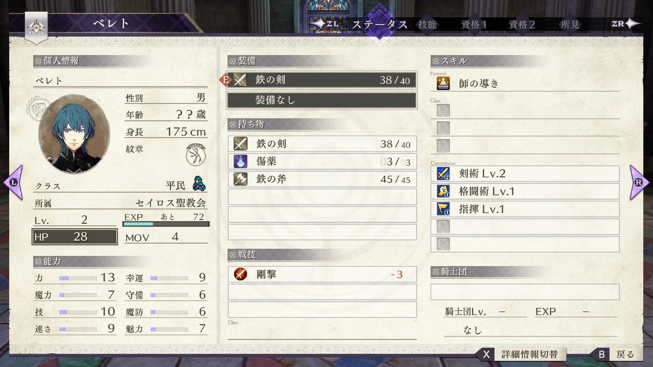 序盤は壁としてまぁまぁ使えるが、徐々に成長率の低さに悩まされることになり、終盤になるにつれて騎士団込みの守備・魔防でも壁としては使いにくくなっていく。