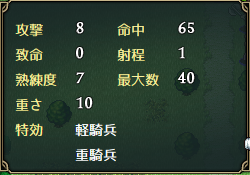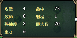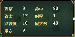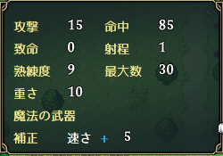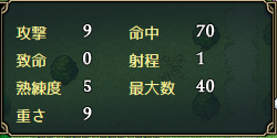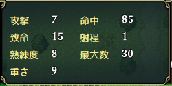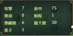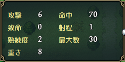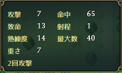 威力・命中・使用回数が序盤で手に入る武器にしてはかなり優秀で弱点は重さが9ある所くらいしか見当たらない。