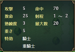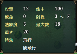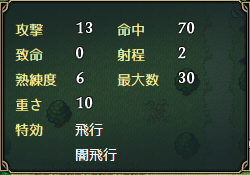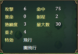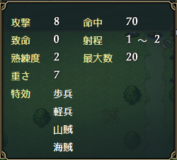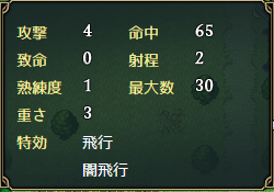 序盤から手に入る分、威力や命中が弓の中では最弱であるものの、敵の守備力が全体的に低いので威力の方も当分は気にならない。