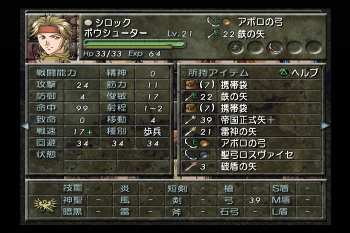 序盤は高性能の弓や食事で命中を上げておかないと本当に攻撃を当たらなくて使えないユニットだと感じるものの、我慢して使っていけば必ず強くなるので頑張って育てよう。