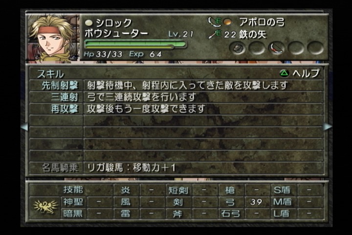 弓技能の成長率が70の時点で既に嬉しいが、【連射】や【再攻撃】をよく使うシロックは70という数維持以上の技能成長率を感じることだろう(リースの【連続】と時と全く同じ感想)