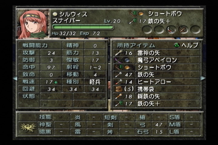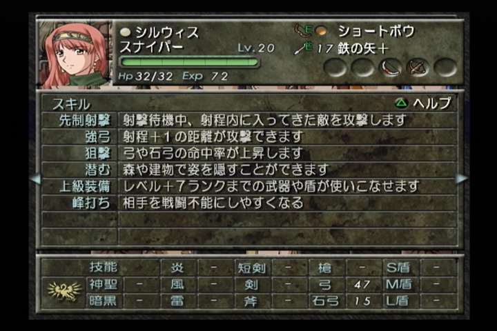 武器は弓と石弓を扱えて技能成長率や初期値が良いのは弓、なのでシルウィスは弓をメインに戦っていくユニットとなっている。