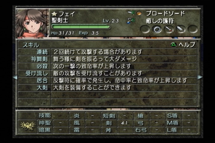剣の初期技能も最初は4と低すぎるが、専用の剣であるカトラスの手数の多さや技能成長率90のおかげでグングン伸びていく。