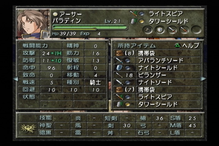 相方のルヴィとは違って最初からS盾とM盾の両方を装備出来て成長率もダントツ、どちらかの盾だけに絞って使っていればクリアまでに余裕でカンストするほど成長しやすい。