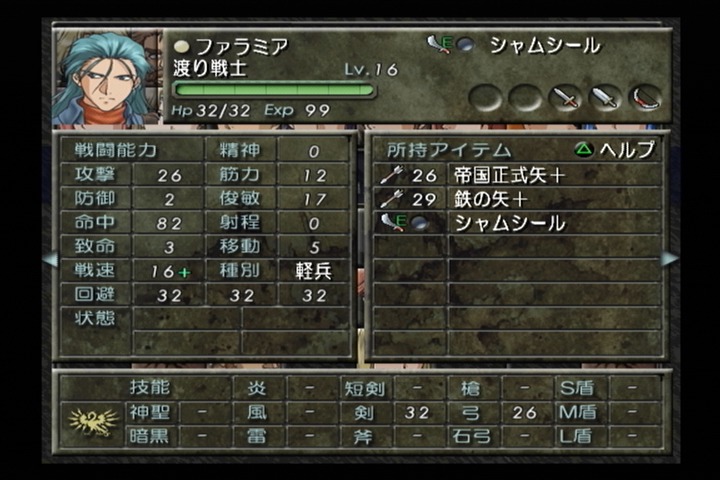 しかし軽兵で移動力が5もあったり、剣と弓を扱えるのは替えが効かない性能のため、強さでは無く便利さという面で活躍することが出来る。
