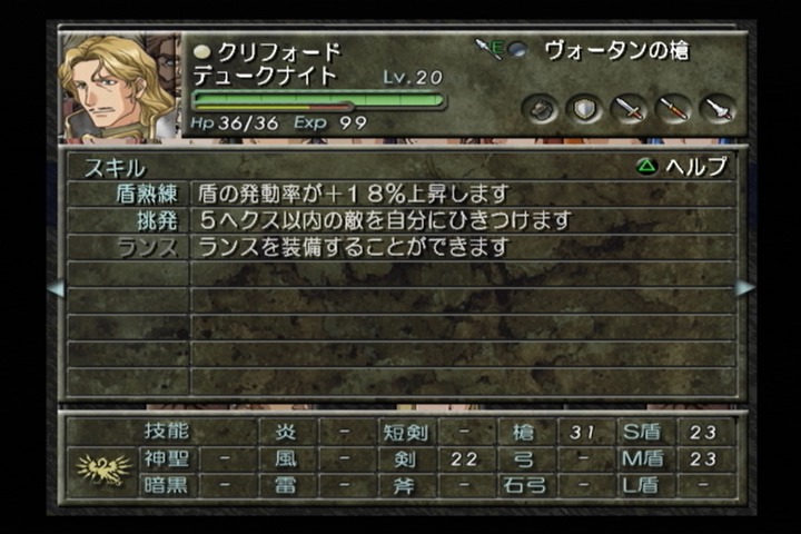 いちおう技能成長率は剣の方が50と槍よりも高いが、鍛えても最大値が30と低く、槍の初期値にも及ばないので、最初から最後まで槍をメインに戦っていくのが無難な選択。
