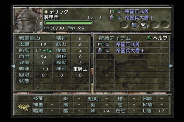 デリックを使っていく場合は斧とL盾どちらの初期技能も低く、攻撃を当てることもL盾で防御することにも常に不安がつきまとうことだけはしっかりと覚悟しておこう。