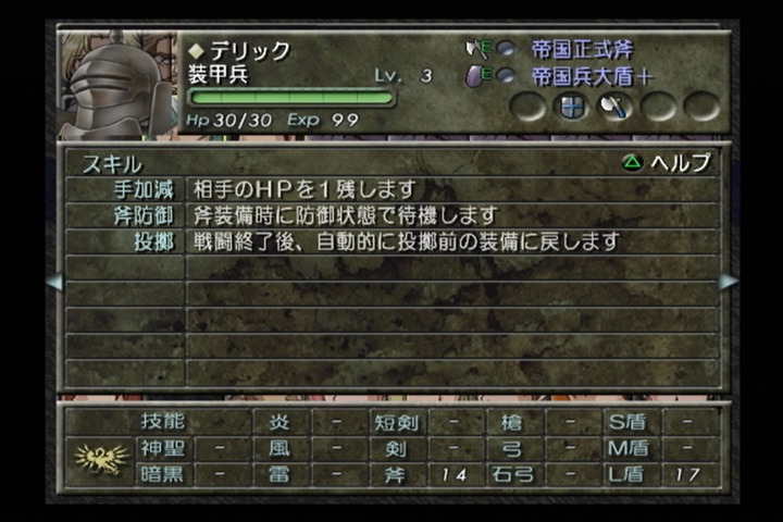 スキルは中の人の性格に合った【手加減】、そして斧を使っているので【斧防御】、なんか微妙なユニットが習得している印象のある【投擲】など、3つのスキルを持っている。