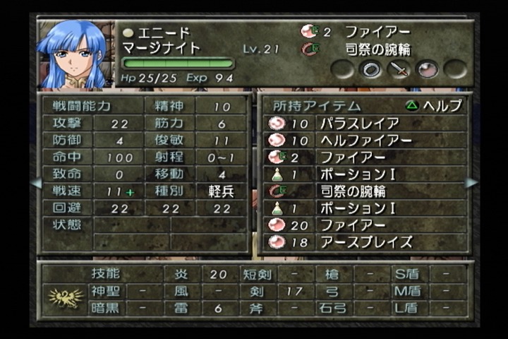 序盤は少し心許ない炎魔法の命中率も技能成長率80という高さもあって、すぐに100%になる所もエニードの強さの1つとなっている。