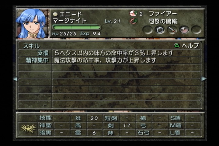 スキルはSRPGでは才能を秘めている感じがする【早熟】と5マス以内の味方の命中率を3%上げる【支援】、そしてクラスチェンジ後に【精神集中】のスキルを習得する。