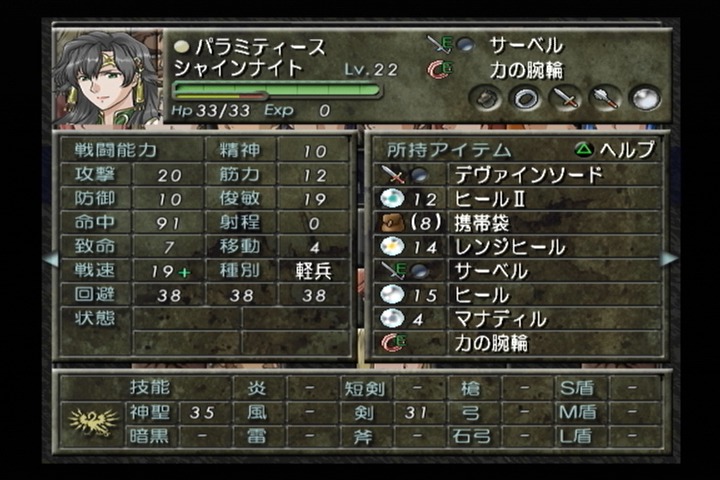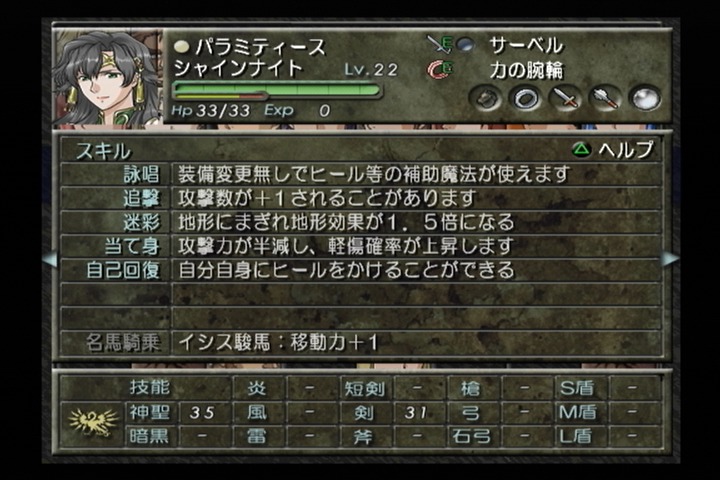 12章という終盤の終盤で加入する割にはステータスがどれも高く、回復役であるにも関わらずある程度の攻撃に耐えられるのはパラミティースの専売特許となっている。