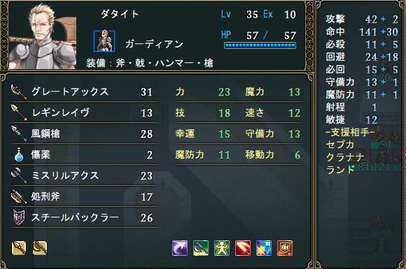 強敵相手にはシールドブレイカー、騎兵にはタイタンソード、普通の剣として賜鋼剣、【達人・剣】を含めた力27による2回攻撃が出来る風牙などが主力武器となる。