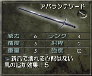 重さ6と剣の中では重い所が少し気になるが、中盤からこの威力の剣を使えることを考えると「しょうがないか・・」と思わなくもない。