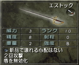 威力が3とびっくりするほど低いが、精度が8と極めて高いので攻撃がほとんど必中となり、そして2回攻撃も出来てさらに盾まで無効に出来るという優秀な効果がてんこ盛りの武器。