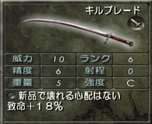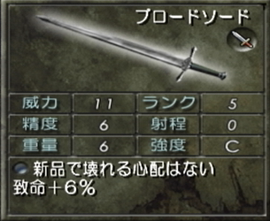 威力や精度も高くて軽く、致命率が18%もあるので最初から最後まで活躍する優秀な剣。