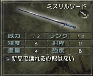 ミスリルという高級そうな名前の通り、威力・精度・重量・強度の全てが高水準なので終盤の主力武器として間違いなく活躍してくれる。