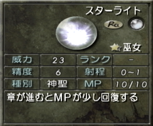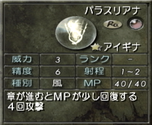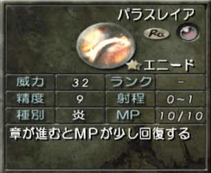 威力以外にも精度が9とパスカニオンと同じ命中率がありほとんどの攻撃が必中となり、さらに章ごとにMPが2回復するので、積極的に使っていける所も素晴らしい。