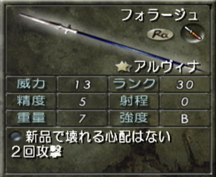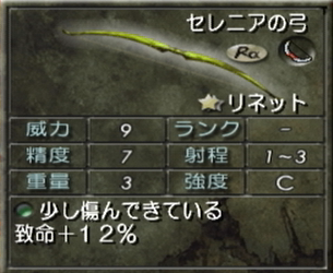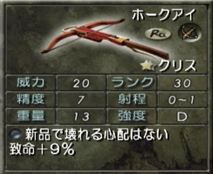 威力20や精度7は石弓としては優秀だと思うが、相変わらず重たいし強度もDで壊れやすいし持ち味である致命+9%も正直微妙すぎる。
