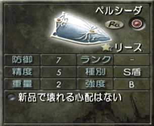 まずはS盾なのに防御が7もあるので大幅にダメージを減らすことが出来るし、精度も5なので発動率も高い、そして重量2と超軽量なのでリースの性能としっかり噛みあっている。