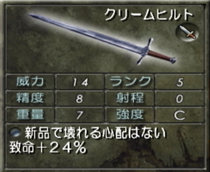 威力は9で普通、精度は7なので優秀、重量も3なので筋力の低いフェイやルヴィでも戦速落ちに悩むことが無いのは素晴らしい。