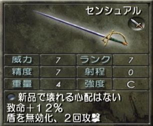 いちおうデメリットとして、2回攻撃の剣なのに強度がCと微妙に脆いので使いすぎるとすぐに壊れるので使い過ぎには要注意。