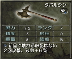 精度5は斧としては心許ないが、その点は2回攻撃が出来る性能で目を瞑りましょう。