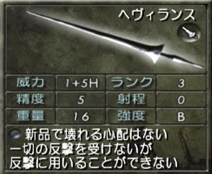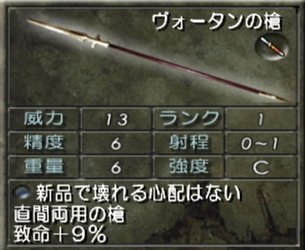 「ほんとに合成で入手できる槍なのか?」ってくらい威力と精度が店で売っている槍とほとんど変わらないのが残念すぎる・・・