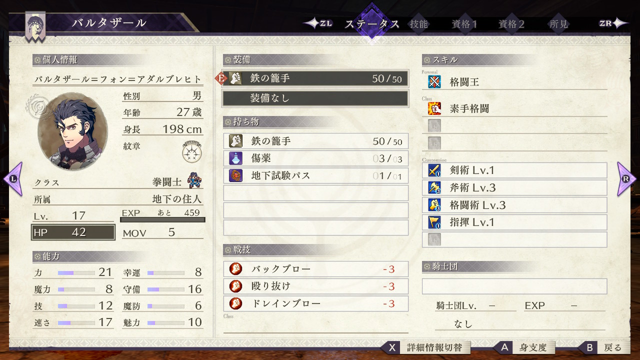 「格闘回避+20」を習得後は技と速さに成長率ボーナスが貰えるグラップラーに戻すか、頑張って斧技能を上げてクリティカル重視のウォーマスターを目指すかの2択となる。