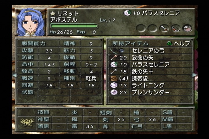 そしてリネットの専用装備であるセレニアの弓は射程が3もある強力な弓なので一方的に攻撃する事が可能、もう1つのパラスセレニアも古代魔法らしく威力の方が凄まじい。