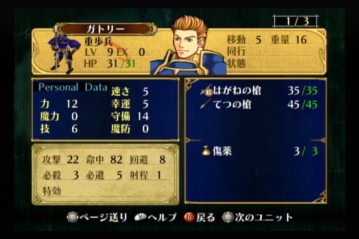 ガトリーはオスカーが使っていた中古のてつの槍とはがねの槍だけで難易度に関係なく十分戦っていける(手槍はお好みでどうぞ)