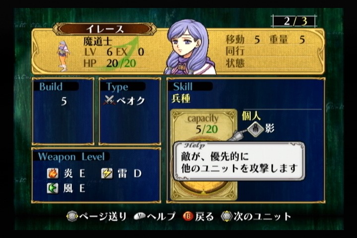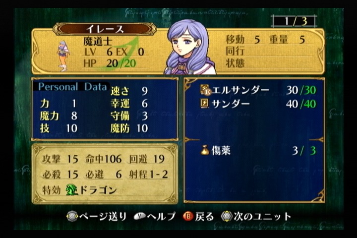 同じ魔法ユニットであるセネリオの魔力と速さを力に割り振った感じの成長率になっており、力が成長しやすいので魔導書の攻速落ちを速い段階から克服できるのがイレースの強み。