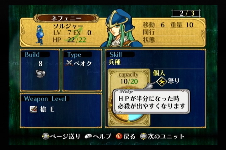 その後は有名な【怒り】+【待ち伏せ】のために【待ち伏せ】を習得させたり、HPの成長率にムラがあるのでHPが上がる天使の衣を使って耐久力を上げるくらいだろう。
