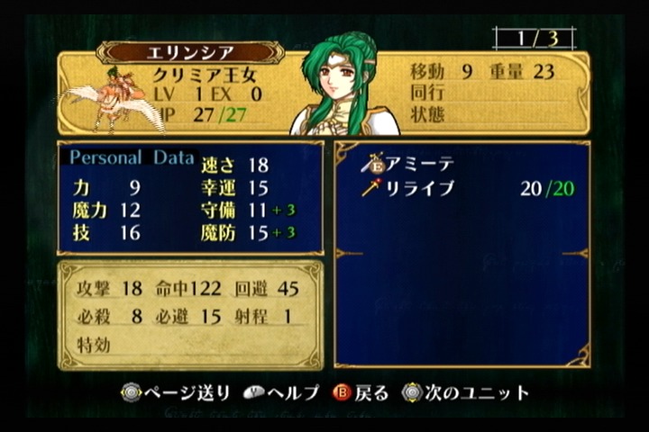 そして、エリンシアの専用装備アミーテは耐久無限で2回攻撃、守備・魔防が+3されるという強力な剣となっている(とは言っても非力すぎて攻撃することは無いに等しいが・・)