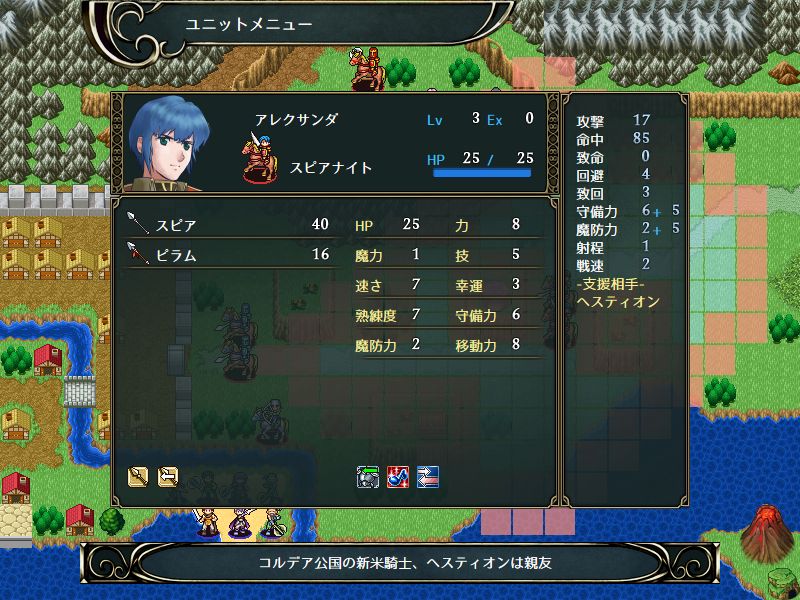 武器はスピアナイトという兵種名通り槍しか使えないが、ヘスティオンとは違って下級職の時からピラムなどの間接槍が使えるので利便性と言う面ではアレクサンダの方が上。